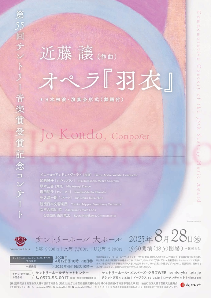 第55回(2023年度)サントリー音楽賞受賞記念コンサートとして、同賞受賞者である作曲家・近藤譲さん唯一のオペラ《羽衣》が演奏会形式で日本初演されます。このオペラは1994年の「フィレンツェ五月音楽祭」が委嘱し世界初演したもの。およそ30年の時をへて、日本初演が実現します。